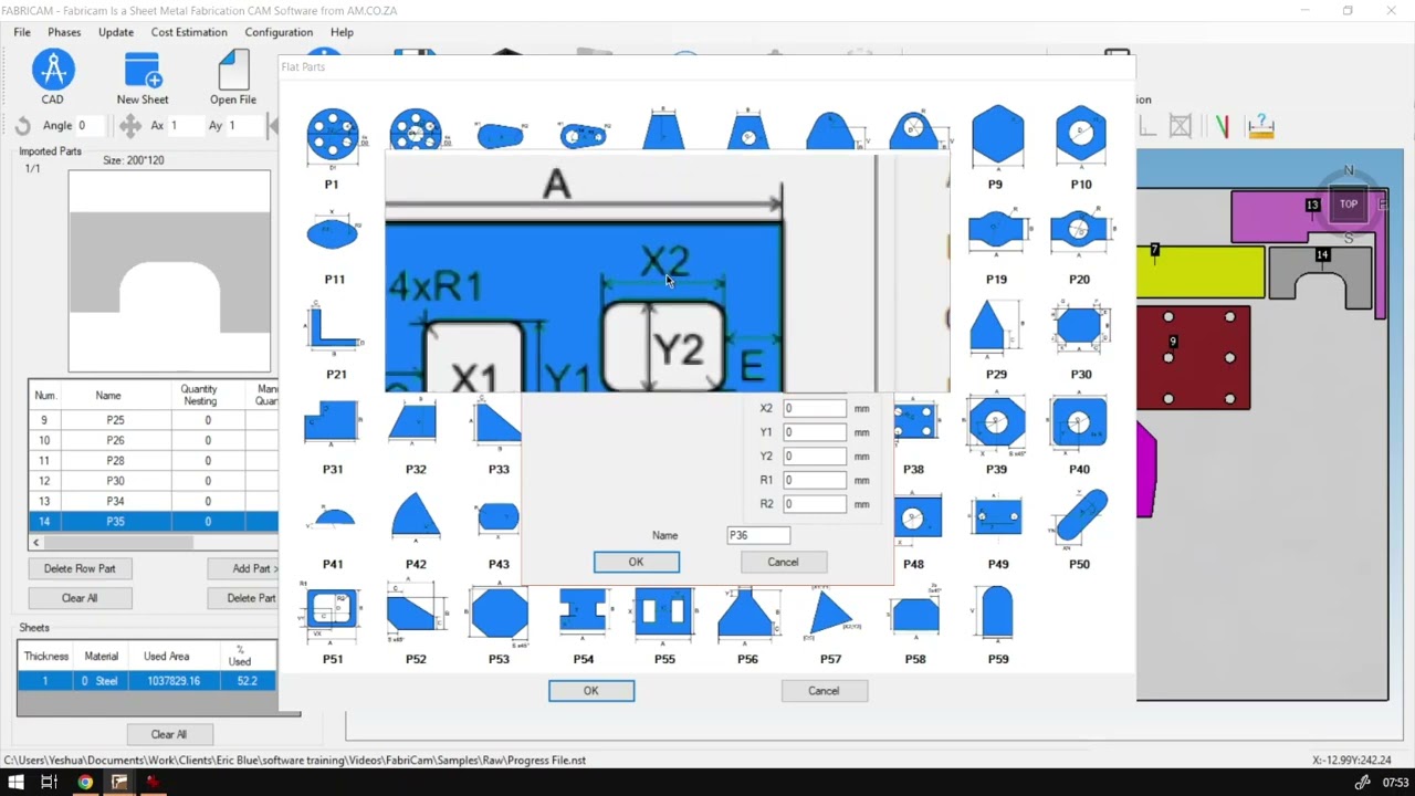 Hi guys. In today's video, we're gonna be looking at part number 36 from our advanced parts. But before that, let's have a quick intro first. Mhm. So today's video can be found on softwaretraining.co.za z. We make sure we need to watch problem solving videos and we also have daily updates. Otherwise we're back into the programme here now, in today's video, like I mentioned, going to be looking at part number 36 I think this one just about rivals are 11 options part. But it might be one less. I think it might be about 10, but yeah, anyway, Okay, so let's head into it. Let's go flat part. We go for part 36 openness. And as you guys can see here, we've got quite a number of options to set. Now I'm gonna just zoom in here, so we're gonna look at what we've got. So now obviously, I like to break it down to the basics, and then we slowly build upon that. So first of all, we've got a A and B, which is gonna set the overall rectangles with the night, and then you will notice what we have to rectangle cutouts inside the large rectangle. So it's a good way to view the shape. So it makes a bit more sense so we can break them into individual parts as well. Then we have next up. So after the a m B, we've got the C and D over here, which is how far this first rectangles from the side of the Cube and our high it is from the bottom. Then on the other side here we've got the F and E, which basically does the same thing. But with the second rectangle, Then what we have. We've got an X one and y one and x two and y two, and this will be setting the width and height of your rectangles. So we set the width and height, and then we've got our one, which is, um, setting the rounding of these corners on the first rectangle. And then we've got our two. As you can see, four times are two, which means that it's gonna be sitting four of those angles. So I would say, Let's quickly adjusted. So let's go. But I'm gonna make this a bit broader, so we can try fitting both those. So A and B 302 100 then we've got C and D. I'm gonna keep this one. Maybe about 20. 30. Then we've got the in app. So it's the other side. Uh, I make it a little bit larger, maybe about 50 and then I'll make this one about a D I It's very good to see me just to be safe. And then we've got X one and x two. So it's gonna be the size of the fish rectangles. I'm gonna make the first one, maybe a square and the second one, we can make more of a rectangle. So I'm gonna go about 50 by 50. I think we're still safe, and then we go the y. So this one, I'm gonna make about 80. So this is the Y. Let's make sure, Sure, why one gonna So I see they put the wires together and the access together, so we're gonna want to do X one and y one. So this one is gonna become 50. So why was gonna 50? And then we're looking at white to make the height of this 1 80 and then we'll make X two guys. Leave that at 50. Now, I'm gonna put these two, maybe 10, and let's just see if we have any problems. We prove our shape. Okay, there we go. We've got our shapes. I could have made my shapes a little bit larger, so I think Let's quickly do that. So we go x one and X ny one. So let's try about 84 x one y 1 80 give you that. There we go. It looks a bit better. And now I want to make the width and height of the X to also bigger. So it was 60 by about 100. There we go. We've got our shapes. And obviously, like I always say, given mind these measurements will depend on your actual product you're making or the shit you're gonna cut out. So most of those should be pre measured, ideally, so you can simply just throw it into the programme and calculated you might define adjustments, but, uh, for most of the parties should be fine. I'm just obviously for the sake of the tutorial, so I like to just, um, adding some different values. Okay, So manual, 21 Add it and let's add that to our cutting sheet. Here we go about our rectangle with two rectangle cutouts with a rounding. Yeah, that covers P 36. If we head here to softwaretraining.co.za z, you guys will notice we've got a variety of different Softwares we do cover, and you can also isolate your search on the top, right? If you do not, however, find the training videos you're looking forward, just simply go here requesting training video fell in the mini form. And then we'll do our best to try and make that for you. But otherwise thanks, guys for watching and cheers.