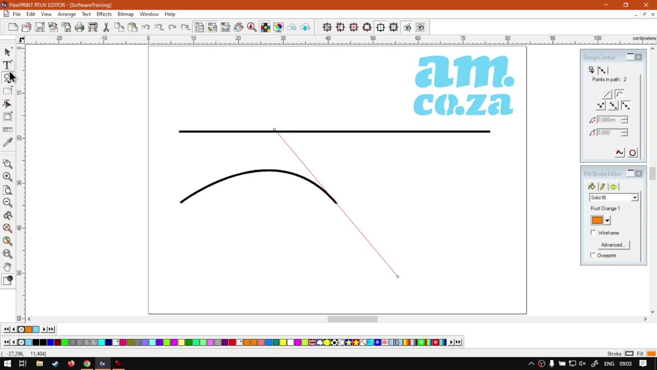 All right, guys, In today's video, we're going to be looking at creating some curved lines using the path tool with flexi print. But before that, let's have a quick intro first, so today's video can be found on softwaretraining.co.za. co dot Z A. We make short and easy to watch problem solving videos, and we also have daily updates. Otherwise, we're into the programme here. So now in the previous video, if you guys can remember, we looked at creating straight lines. So if I grab my part tool here and I just make a simple left click, I'll shift in and place a straight line on top here. Now, in today's video, we wanna be looking at creating a curved line. Now, if you want to have any dynamic form of shape, then this is what you want to be doing. It's using curve lines where a straight line is very nice for static. So maybe if you want to do something more like rectangles and so forth those type of shapes, then, um, the straight lines are nice. But now, to create the curve lines, we're going to use exactly the same tool. But with one key difference. So now our first point, though it's gonna be the same as a straight line. So I'm just gonna left click to place where I wanna start our actual curve. Then what I'm gonna do is I'm gonna select our second point. But this time I'm gonna left, click and hold in the left mouse button. You'll see our cursor changed. And, uh, there's, like a demo line that is red. I'm not sure if you can see it, but it is there. So now what I can do is when I, with my left clicks held in, I can simply move my mouse to where I want it. And I will start getting a preview of where this curve is going to go. So I can nicely decide how extreme do I want this curve. And when I'm happy, I just leave the left mouse button and then it will start creating that curve. Now, keep in mind, though, we are still in the actual, uh, path tool, which means if I had to click anywhere else, it will create another point. So I'm gonna do the same thing left, click and hold in. And at first you you might notice it just gives us a straight line, but that is because it just lets clear he gives a straight line. But if I move this mouse just slightly, you'll see it quickly pops it into a curve. That is, um, what's relevant to this point over year, because at this point we had two note, uh, adjusters, which was extruding far past. And that's why if I move this one just a little bit, it will give us such an extreme curve. It is not because of these two note controllers I have here, but it's because of our previous one that we have such a nice curve. So I'm going to let go of left click, create the path there, and, as you can see the same tool, we've got a nice curvature here in this path. Now I must be honest. The path or the curved paths are slightly trickier to make because of these node arms. Now you do get different controllers for these note arms, so the way they behave, but we will cover that in another video because it's a slightly more in depth topic to cover. But yeah, otherwise, this is a curved line. I'm just gonna quickly create another one as a recap. So once again, the main difference is with our path tool. We want left click. Ok, that is still the same as our previous one. We left click, then, uh, we want our first point. Then our second point. What we want to do now is left click and hold in our left mouse button. Then we can move this curvature to where we want it. And if I'm happy, I can let go and then click where we want our last point. And once again, as soon as I move the mouse a bit, it's going to pop to where this last curvature was. We can obviously adjust this with this new point. As you can see, we can get a nice little swirl going there and then if I can just exit the tool to confirm that, But yeah, that is pretty nice. Like I said, you're gonna make some very nice dynamic shapes. Obviously imagine these shapes being closed. Let's maybe quickly just do that with this one. Then I'm gonna go over here and let us close this path up so you can see now we've got quite a dynamic shape here using the path tool where in order to get this with something else, we would have to create a circle and then have a cut out and so forth where we did all of that with one tool. But yeah, otherwise, in the meanwhile, though, if we head here to softwaretraining.co.za. co dot Z a you guys will notice we've got a variety of different Softwares we do cover. And you can also isolate your search on the top, right? If you do not, however, find the training videos you're looking for, just simply go here, request the training video, fill in the mini form, and then we'll do our best to try and make that for you. But otherwise thanks, guys, for watching and cheers.