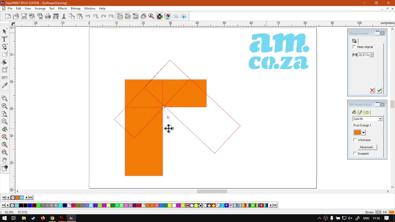 Alright, guys, In today's video, we're gonna be looking at the mirror feature within flexi print. But before that, let's have a quick intro first. So today's video can be found on softwaretraining.co.za. co dot Z A. We make sure easy to watch problem solving videos, and we also have daily updates. Now if we head into the programme here. So like I mentioned, we're gonna be looking at the mirror feature. This is a great picture, and it's very hard to duplicate. Um, without using this feature because you'll have to recreate things in a mirror version. Now I'm gonna quickly just create something that is obvious when it's mirrored. So let's grab two rectangles, maybe make a bit of a upside down. Alia, move this one up and then join these two together. So here we go. We've got a nice little, uh, upside down L. The reason why I do that is if we have something like a rectangle and if I had to mirror this, you wouldn't know Cos if I had to rotate this. It stays exactly the same thing Where with this one, if we rotate, it becomes obvious that it's rotated and not mirrored, but anyway, so now with this, I'm going to scale it up a little bit. Now, in order to use the mirror tool, you wanna make sure you've got something selected that you want to mirror and then under our main menu on top, I'm just gonna navigate to the arranged drop down menu from that, and then we're gonna go down till we find the option called Mirror. Now, when I click that, it's gonna open up, um, the design central with its settings. And then you'll see we have a little preview and red on what's happening now. I'm gonna, um just leave it on. What? It was originally the default. Don't worry about what I said. There. I'll show you now. So then, on our actual viewport here, there's, um, a few nodes that we need to look at. And then obviously we've got like, I mentioned our preview of what's gonna be happening. Not under these nodes. We've got a top one, a middle one and a bottom one. In my opinion, the middle one is the most important. So if I have to left click that hold and drag, you can see we can choose how far this mirror is going on the horizontal plane. So we either put it this side or that side then or the top and bottom is gonna do. It's gonna become a form of a rotation. So if I had to select this point, the bottom point, it's gonna rotate it around the top point. So let me just show you. So I'm gonna click that, and there we go. We've got our mirror rotating around the top point. So this is a great way if you wanna do kind of like a horizontal or I mean a vertical mirror, seeing that you don't have the option. So what you'll do is you'll use these points to rotate it. Now, keep in mind, you can also constrain the rotation like we did before, so if you keep shifting, then you'll see it as a 45. And there we go. We've got a full 90 so you can quickly choose where you want to. Let's say you want to mirror it on top and you can rotate it, then let go, Then click the metal one again and move it to the right location. Likewise, you can also rotate it from the other point, or what you can do is I can select one point and then move it somewhere and then rotate to the other one around that point. That's all a little bit complex like that. But I would say the most important is we go to mirror again. So main menu arrange mirror is that the middle one will set how far away the mirror is, and then keep in mind the one point rotates around the opposite point. So if you start top or rotate around the bottom point and likewise bottom around the top and then with this one, it's very handy. Keep shifting and constrain. It gives you the best results. Then, if you like that, make sure you press enter or the little right mark here on the Sign central panel, and that will confirm it for you. And as you can see, it's now mirrored our shape. Now, by default like you might have noticed, is it will mirror our shape without making a copy. So pretty much just as like a form of flipping tool so you can take your shape, flip it around in the opposite direction. Now What I'm gonna do is let's quickly mirror it using the design centralizer so I can go to arrange mirror and then under the Design central, we have, um, two options. And obviously they confirm the first one will be keep original. So if I click that when it mirrors, it's gonna make a copy of it, which is very handy, or it's gonna leave the original as well. Then we have here the distance, you'll see we only have one setting for the distance. Now you definitely in this. At least in my opinion, this is one of those tools where you wanna use, perhaps more the freehand. If you want precise distance between them, maybe two centimetres. You can use this, but like I said, uh, in order to get a vertical mirroring up or down, you can't do it with that. So then you wanna look at these points and adjust it accordingly? Just move this or maybe on the inside, leave a bit of an overlap pressing to There you go. We've got our shape nicely mirrored. Saves us a lot of time, and like I say, some shapes, it's just not possible. Especially when we get you things like text and that you can rotate it as much as you want. It's not gonna gonna become a mirror, but yeah, otherwise, that is it on the mirror feature. Um, a quick recap. We got the free ant mirroring that we can do and the one on the design central. But in my opinion, like I said, use the free ant in combined with design central and to locate it. Main menu Arrange mirror. Yeah, otherwise, in the meanwhile, if we head here to softwaretraining.co.za. co dot Z A you guys will notice we've got a variety of different Softwares we do cover. You can also isolate your search here on the top, right? If you do not, however, find the training videos you're looking for, just simply go. Yeah, request the training video, fill it in a mini form, and then we'll do our best to try and make that for you. But otherwise thanks, guys, for watching and cheers