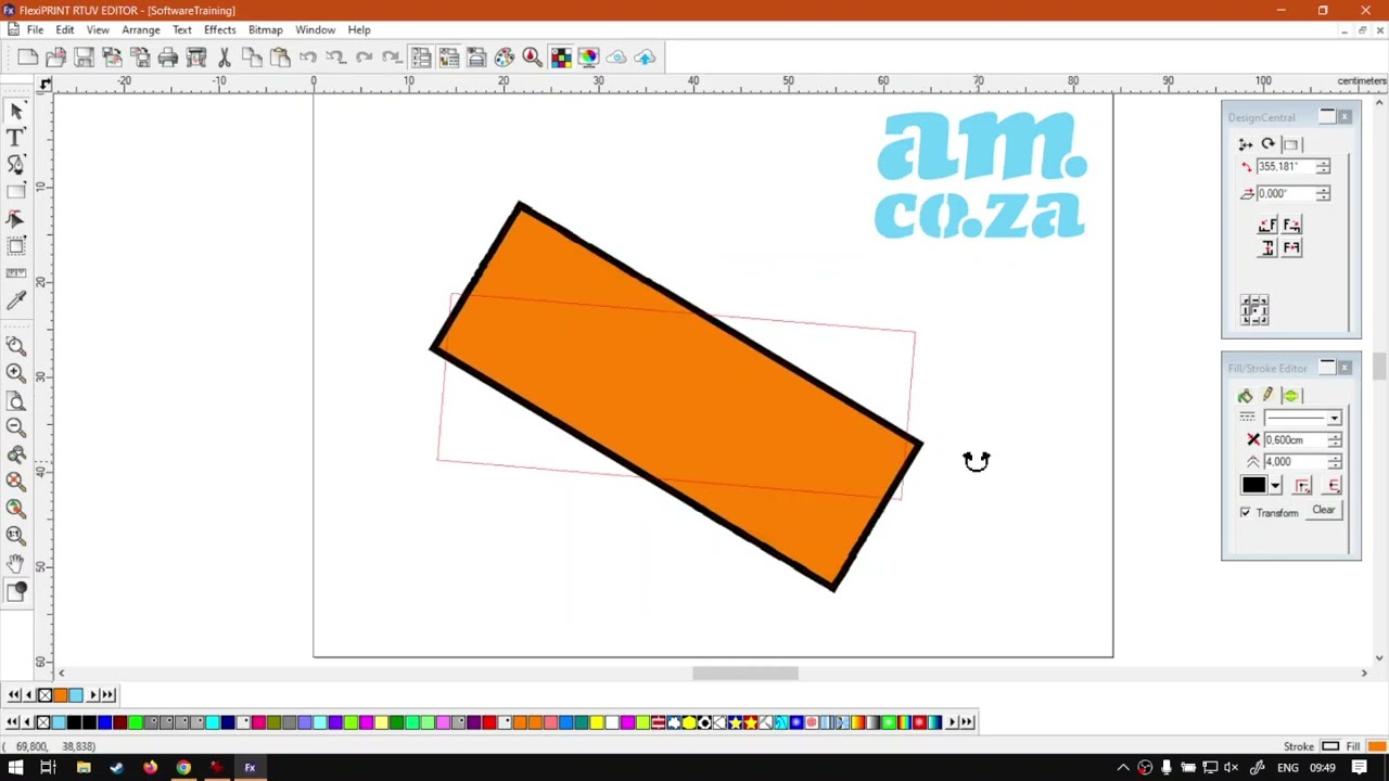 Hi guys. In today's video, we're going to be looking at rotating objects with in flexi print. But before that, let's have a quick intro first. So today's video can be found on softwaretraining.co.za. co dot Z A. We make sure and easy to watch problem solving videos, and we also have daily updates. Now, if I head into the programme here like I mentioned in the intro, we're gonna be looking at rotating objects. So let's just quickly create a rectangle so we can see something that is being rotated. Now when it comes to rotating, there's two main ways we can go about this. Um, yeah, I'm gonna cover the easiest one at first, but it's not necessarily the most precise. So in order to rotate, we wanna make sure our selection tool is enabled here or selected. Let me just fix the zoom there. So it's the first one on our secondary toolbar, and then with your shape selected, all you wanna do your scale is a bit up for the sake of the video is double click it. If I double click this, you might not have seen on the video, but these little node arms has changed. So I'm gonna try double click again, can say we've got a certain thing, then another thing. And then we've got the actual rotation arms. And if I hover over these, you can see my mouse cursor changes to a lower rotation icon. You know, if you can see it over there. So any one of these four corners, so not the in betweens. So the actual corners this will rotate your object or your shape. If I left click on that. Hold in and move. You will see. There, you get this red outline of where it's gonna rotate it to. Then I can simply if I let go, it will place it in that new rotation. Now there's another thing we can do. We can constrain this as well. So if I rotate and I keep shifting, it will do it in 45 degree increments. So you can see there. We can now go exactly 45 degree and rotate that we can change the, uh um increments that uses. But I will show you that a bit later then next up on this actual, uh, free and transform in the middle Here, you'll see we've got this little white dot Now, this is the origin of rotation. So if I rotate these arms, it's gonna rotate around this point. So if I wanted to, I can simply left click on this point and move it to a new location. Let's say I wanna rotate around that corner. Now, if I use any of these rotating arms, it doesn't matter where they are. It's gonna rotate it around that point, as you can see so we can rotate it like so around that point. Now, this point can also go outside of your design. So if I click it and I move it to the corner of the page here now, if I rotate this, it will rotate it around that point very handy. Um, little feature. If you wanna do specific rotations, just keep in mind. If you've confirmed it and you go back into rotation, it will reset the point to the centre. Now, let's say we want to change those increments of how much it it is rotated by. Then what we can do? I'm gonna kind of try and align this a bit more levelled now, uh, this is not really necessary. You can do it on the con, uh, design central panel as well. But what you wanna do? Go to your main menu on top? Let's fix the zoom and we go to edit and we navigate down till we find preferences. I'll open that and then under our general tab, our first one, you can see we've got here constrained angle the moment it said to 45 degree. But let's say I change this to 15. Maybe I want more control over it. So OK, now, if I rotate and keep shifting, you will see it does it in 15 degree increments. So this is sometimes handy if you wanna have um, like I say, more control over the, uh rotation without it just being completely free hand so you can calculate it more easily. I'm gonna go and set that back to the default just now, Make a video in the future and you guys are like my programme is not working like yours might be confusing. Now, another thing. Let's say I wanted to set this exactly back to its original rotation. You can see that can be quite tricky. And that's where the design central comes in handy where this is, um, a place where you can do exact rotations. So if I zoom in here on the right, make sure your design central is open, you will see you can find it here on your, uh, primary or main toolbar. Just simply click that and then it will open it. Then make sure you navigate to the second tab by default. It will be on the first go to the second one with that little arrow that spins, it's for rotation and then you'll see the first option here is the rotation. So now if I want to set this back to exactly zero degrees, I can highlight that press zero press enter, and then it will reset it. So I'm just gonna make it more obvious. So let's say you wanna go back to zero. Set it to zero now. Likewise, you can obviously set an exact, uh, mount. Let's say I want to go, uh, 34.5 degrees. I think it's comma five. There we go. Then I can do that. I can set it to exact amount of degrees of rotation in this section very handy. And then at the bottom. Here you will see we have this little weird rectangle with little subsections that we can select now, like with a free hand where we can click this thing and move it around. Now we can set it here as well. So let's just default this back to zero so you can see nicely. But this will constrain it to your actual design, the selection within your design. So if I go top left corner, we'll move that little dot bottom right and then centre. So that's also a quick way. You can do it. But the beauty is like I said in the design central, you can go exact measurements, so if you need something very precise, But if you kind of just aligning things, getting things more or less right there in the free hand is definitely quicker. So just a quick recap. So we've got the tool. We've got a free hand rotation and the design central the freehand. You wanna make sure with your selection tool, you double click. So you get these little rotating arms, then you can rotate it from there and then with the design