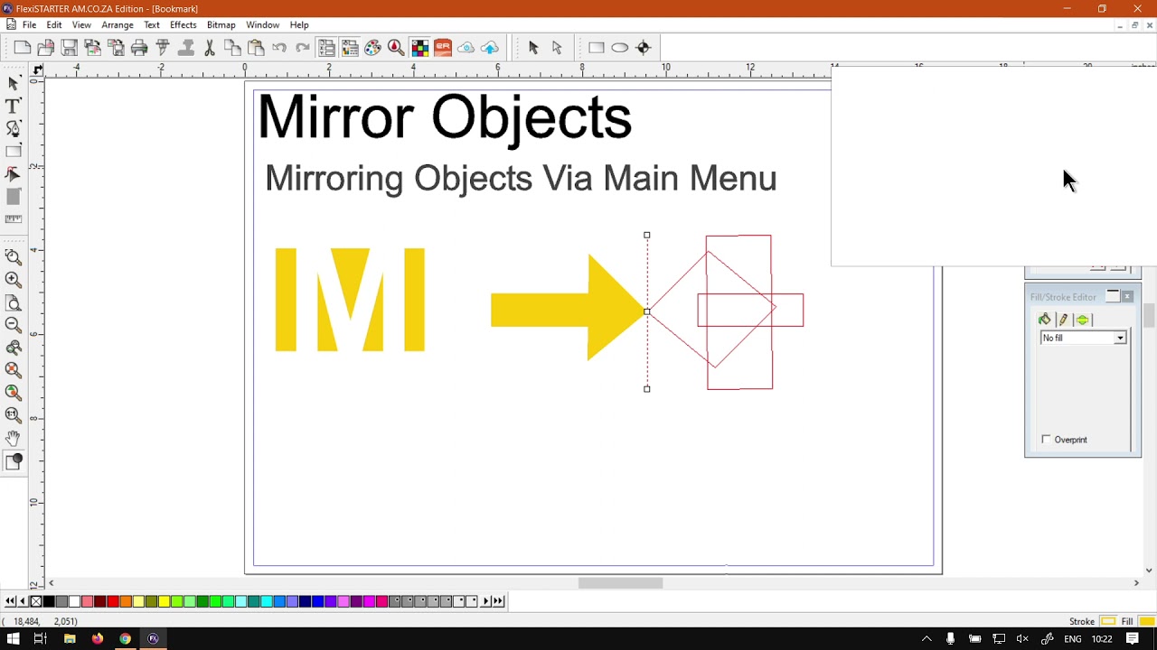 Alright, guys, in today's video flexi starter, we're gonna be looking at how to mirror objects using your main menu. Before that, let's have a quick intro first. Mm. So today's video can be found on softwaretraining.co.za See that today we make sure and easy to watch problem solving videos, and we have daily updates that was back in the programme. Now, this is gonna be, uh also this video is part of a miniseries which covered, um, rotating, scaling and moving. This is just a few loose ends, Um, that we did not cover yet, which I'm gonna add to the same little series. So, in any case, to mirror object now, there is a difference between flipping object and mirroring object. We will cover flipping object as well. But in this video, we're gonna be looking at mirroring object now, uh, on in order to do that, obviously you need your object selected. Then what we can do is we go to our main menu on top. Mhm. Then we go to a range and we're gonna go right to the bottom where it says mirror. Now, once we've clicked this, you will see we have a few different options here. First of all, we can set on the right here on our design central panel. We're just this we can adjust the distance that we wanted to mirror too. And then obviously, on top of that, we have the option where we can say keep original so they want to press enter. Then it's gonna keep both the old one and the new one. So I think for the sake, let me keep that on for now. And then what we can also do is, as you can see, we've got these control points on the actual canvas or design area. Now the middle one. If we click this and move it, it will do the same thing. So we just sit there on the design central. Well, basically set the distance. Uh, if we use the top one, as you can see, we can actually rotate it. Likewise, if we had to use the bottom one, we can also rotate it. Now I'm something to keep in mind. You can also use it with shift. Then it will do it in degrees amounts. So yeah, that is one thing that is quite nice about it. Otherwise, you can either go here on your zone central and you click on that little right mark. If you like the changes or you can just simply press enter now you can see because we've kept selected, I keep original. We've got two of them. It's an exact mirror of the Pharaoh. Obviously you can keep that off and then will not make an exact copy. So now, once again, just a quick recap. So to locate it, make sure your object is selected. Then we want to go to main menu, then arrange go down to the bottom and mirror. And then, yeah, you pretty much you can adjust it away like and then just press into press that little but and then it will do the mirror for you. Otherwise that is it. On marrying objects, we had years to softwaretraining.co.za Z day. We have a variety of different Softwares. Would you cover and then also you can't isolate your search on top here. If you're looking for anything specific, if you, uh however do not find what you're looking for, you can always go your request, a training video and then we will make that video for you. Otherwise, thanks, guys, for watching and cheers