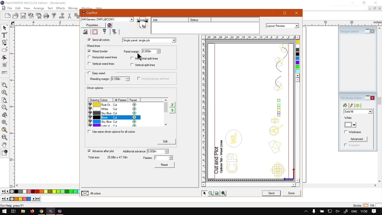 Hi guys in today's video flexi starter, we're gonna be looking at the weed lines. Um they can be found under the options tab for the current board feature. But before that, let's have a quick intro first, Okay? Mm. Mhm. So today's video can be found on softwaretraining.co.za z day. We make sure that easy to watch problem solving videos, and we also have daily updates. Otherwise, back in the programme here now I'm yeah, this feature the weeding in general what you'll use it for. Let's say we made a print of this or a vinyl when we stuck it down, and then we want to take all the extra vinyl off because obviously it's my cut lines here. But if you pull it off at one go, we might pull off some of these letters, and we have to try to really stick them. So the weeding makes it simple, so you can put extra cut lines so you can peel off the waste in smaller portions so you don't have to peel off all this weight and one go, so that is basically where the weed lines comes in. So in order to do that. We want to go to our card and plot feature. You may find you under standard toolbar. You'll see control l to open it. Then under the settings, we're gonna go to the options tab, which is the third tab, and then you will see we've got here we'd lines and a few different options. Now, um, this will obviously vary depending on what type of job you have selected. So, for instance, where the first option here, we've got weed border. So if we are to zoom in here, we can see that. I mean, this border is just on the text so we can go. We'd border and then we put a panel margin. We can increase this and then you can see there at the bottom. It has just increased our border around. She's quite nice, but like I mentioned, this will vary depending on the job style. So if we go separate panel separate jobs, then each individual panel now would have that extra weeding around the the actual design or actual shape it's selected. It's going to keep my mind on the standard one for now. The single panel single job the next up. We've got some weeding lines and horizontal waiting lines. Vertical waiting lines. So what this will do? It will look for a gap that we you can find right through the design without it interacting with another shape. If I go horizontal, we can see yellow zooming. You guys can see it. Put a weeding line right between these. So now when we they want to stick these vinyls, we can simply tear out this entire piece without having to tear the entire white piece. So, like it makes your life easier. So you can obviously do horizontal and vertical ones. You can just drag him out like that. Now what we also have on the right here. We've got horizontal split lines and vertical split lines. Now what this will do, it will actually go through the design. But not sure. I said go up to the design, but not through it. So now you can see when we peel this piece off, it's gonna go around this because obviously this will be cut lines as well. So I haven't gotten these shapes and that ready for cutting. But if we did, then obviously these shapes will be one shape. So now when you peel this awful go around, heat this cut line and then go around the shape. So that is, um, when you have more complex designs on that, it's just gonna be quite handy. The split lines. Obviously you've got vertical and horizontal. As you can see, you will still stick. This is one big panel or vinyl. And then these are the white ones. You can now just simply drag off, which is quite convenient. Then we've got under that. We've got the easy we'd. Now I don't see any updates. When I work around with these, I can kind of imagine what it should be doing. But I didn't see the effects. So what I'll do is I'll kind of just read you guys what I found online, what they say about it, and that is the easy. We'd cuts a week border within a specified winning margin, which will be this margin around each object in your design. So I'm guessing this is like a kind of a quick way of, uh, also doing some of these options if I had to guess. But like I said, I don't see any live updates in the preview. So that is kind of what they say about it. But otherwise that is it on weeding if we had to eat here to softwaretraining.co.za Uh, guys, we've got a variety of different Softwares we do cover. And also you can isolate the search on the top, right? If you do not, however, find what you're looking forward just to hear, request a training video. Then we will make that video for you. But otherwise thanks, guys, for watching and cheers.