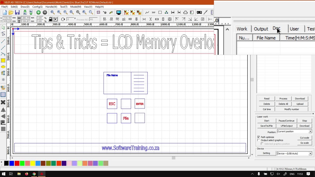 Alright, guys, In today's video, we're gonna be looking at your LCD or laser kind of vice memory overlooked. But before that, let's have a quick intro offers. Uh, so today's video can be found on softwaretraining.co.za. We make sure that easy to watch problem solving videos, and we also have daily updates. Otherwise, back in the programme here now, just a quick reminder. This is a miniseries on the tips and tricks and also the relevant links and description So you guys can actually follow along now in today's video, we're gonna be looking at like I mentioned that laser cutting device memory overload. Now, this can happen if in most cases your device has more than 100 files loaded to it. So this is your actual machine. So it's not your your app over here. Your programme. So if you've uploaded more than 100 files, can I get an LCD memory overload? Um, problem. So in order to fix that, what you can do is we go here to our dock and tab on our control panel, right, making sure your machine is connected to your actual computer. Then What you do is you got to read and then you'll click that and I'll pop up a list of all the files on your computer. Now, you can simply selecting the elite ones. But by the time you buy 100 and you're not using them anymore, you can always go delete all. And then they will clear out all the files from your laser cutting devices memory. So, um, yeah, once again, it's rather simple. So you what you want to do is you go to your dark on your control panel, click read, and then the lead, individuals or the league or and yeah, that's about it on that. It's not so much of a tip or trick, I guess. More of a tip. But yeah. So still making a category of its own or mini series of its own for that. But yeah, that concludes the video if we head here too. Uh softwaretraining.co.za hat sarah website. You guys will notice we've got a variety of different software to cover. And also, you can isolate your search on the top, right? If you do not, however, find the training videos, you're looking forward just to hear request a training video telling me for and just let us know which software it's for. And then we'll do our best to try and make that video for you. But otherwise thanks, guys for watching and cheers.
